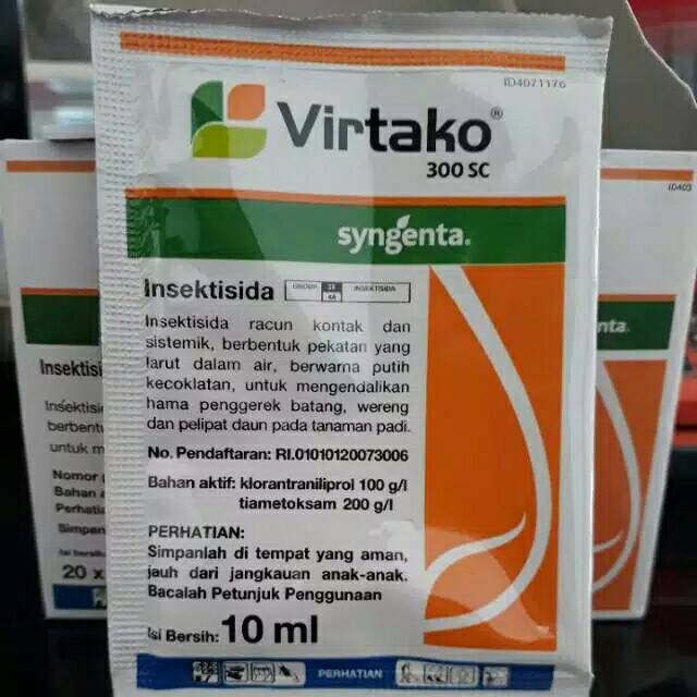 Virtako 300SC 10ml, 50ml, 100ml*Golongan: Insektisida*Cara Kerja : Kontak dan Sistemik*Untuk Tanaman: Padi dan Sayuran*Hama Sasaran: Wereng Coklat, Ulat Grayak, Penggerek batang*Penyemprotan:- Rekomendasi Waktu: Pagi hari atau sore hari- Rekomendasi Dosis: 0,2ml – 0,5ml atau 3ml – 7ml per tengki 14 liter- Rekomendasi Lainnya:* campurkan dengan perekat dan perata agar obat tercampur dengan air lebih merata dan tidak luntur saat terkena hujan.* Pencegahan/Serangan tidak parah semprot 1x dalam 7-10 hari. Serangan parah 2x dalam 7 hariBahan Aktif: Klorantraniliprol 100g/l, Tiamektosam 2