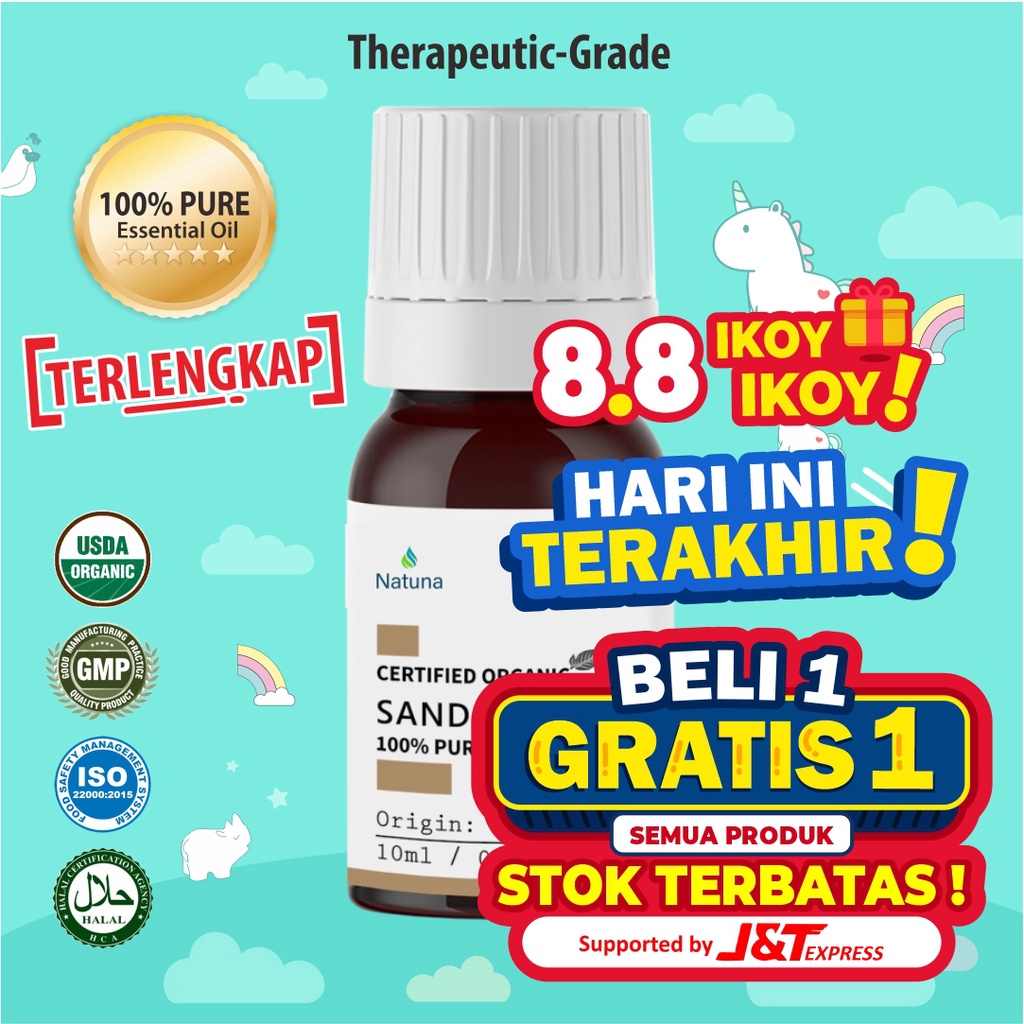 Shopee 8.8 Ikoy Ikoy===[ HARI INI TERAKHIR ]===BELI 1 GRATIS 1 Semua Produk( u/ Produk yang Bertanda Khusus B1G1 )Stock Sangat Terbatas~===================Natuna Sandalwood Essential Oil=============================Size: 10mlCode: N007115Type: Pure Essential OilGrade: Therapeutic-gradeCertified: OrganicOrigin: AustraliaLatin Name: Santalum Album L============================Apakah Anda ingin meningkatkan ketenangan dan kejernihan mental dari hari ke hari?Banyak dari kita mengalami stres atau tekanan dengan begitu banyak tuntutan sehari-hari, sehingga suasana damai sejenak akan amat membantu meningkatkan kualitas hidup.Sandalwood essential oil (minyak esensial cendana) dapat membantu Anda mencapai kejernihan dan ketenangan karena manfaat terapeutik yang luas.Minyak esensial ini tidak hanya memiliki aroma yang luar biasa, cendana (sandalwood) juga memiliki efek pada kesejahteraan dan kesehatan mental, bersama dengan banyak sifat penyembuhan lainnya.5 Manfaat Utama Sandalwood Essential Oil:1. Meredakan Kecemasan dan Mengurangi Stres.2. Anti-inflamasi dan Pereda Nyeri Alami.3. Menenangkan dan menurunkan emosional.4. Meringankan Endometriosis5. Melawan Bakteri & Virus Penyebab Batuk & PilekBeberapa Tips Cara Pemakaian : Diteteskan 2-10 tetes pada Diffuser sebagai Terapi u/ memberikan efek rileksasi & mendapatkan manfaat dari Essential Oil. Dicampur dgn Natuna Carrier Oil, Oleskan pada leher & pijat u/ manfaat ketika diluar rumah atau ruangan. Diteteskan Random / Acak disudut2 rumah / apartmen untuk menghilangkan bau tak sedap secara instant.===============Natuna Essential adalah Brand Lokal u/ Essential Oil dgn Standard International ( ISO ) & Therapeutic Grade dgn Variant Essential oil TERLENGKAP di indonesia.*FREE BUBBLE WRAP, BOX AND LOVE DARI NATUNA ESSENTIAL Lᵒᵛᵉᵧₒᵤ♥#EssentialOil#Aromatherapy #Therapeuticgrade#sandalwoodEssential #Diffu