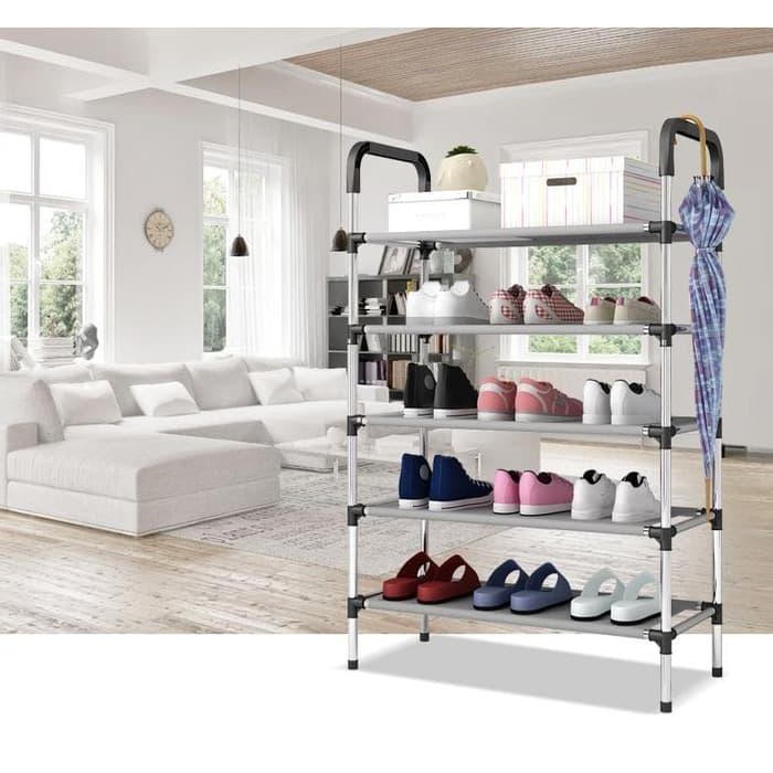 Rak Sepatu Portable 5 Susun with Holder PayungFitur ProdukRak sepatu dengan holder payungMudah dibongkar pasangTerbuat dari pipa besi dan kain non