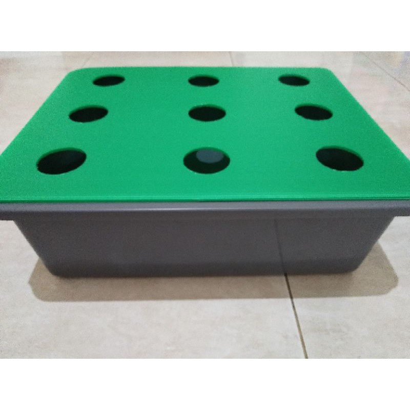 Kit hidroponik sistem wick terdiri dari * Baki dengan ukuran 38cm x 32cm x 12cm* Tutup impraboard 9 lub