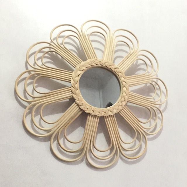 Cermin hias yang di kelilingi oleh rotan dengan diameter 60cm dan diameter cermin 25cm. Sangat cocok untuk mempercantik ruangan
