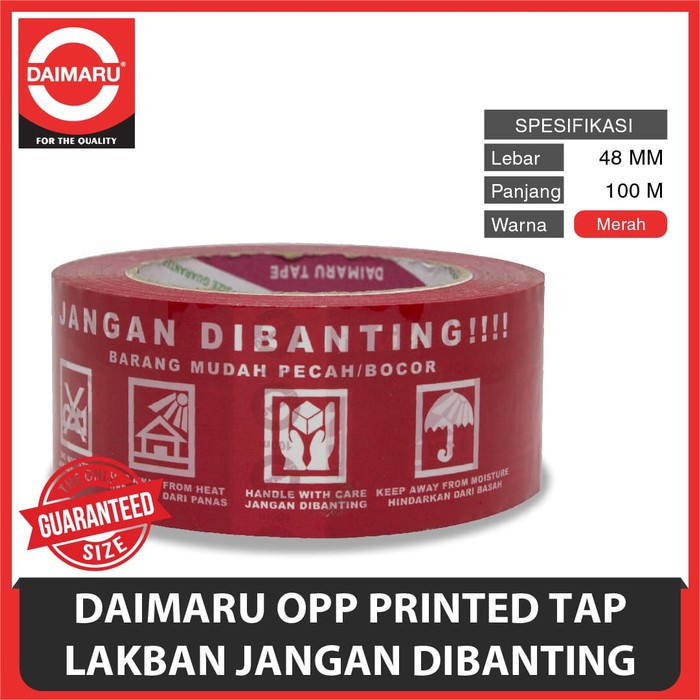Deskripsi Daimaru OPP Printed Tape Lakban Jangan Dibanting 48 mm x 100 meterDaimaru OPP Printed TapeDaya rekat, kekuatan lakban, dan ukuran semuanya terjamin oleh Daimaru sebagai produsen lakban terbesar di IndonesiaHighlight :1. OPP adalah Oriented Poly Propilene Tape; disebut juga Lakban2. Printed dengan tulisan Jangan Dibanting3. Single side adhesive4. Warna dasar : Merah5. Warna tulisan Jangan Dibanting : Putih6. Lebar lakban : 48mm7. Panjang lakban : 100 meter (panjang sangat akurat)Fungsi :1. Pengepakan barang2. Segel dus3. Pengepakan untuk ekspor4. Pengikat dan keperluan rumah tangga atau kantor5. Menandakan bahwa barang harus diperlakukan secara hati-hati selama proses pengirimanDaimaru OPP Printed Tape Lakban Jangan Dibanting Ukuran 48mm x 100