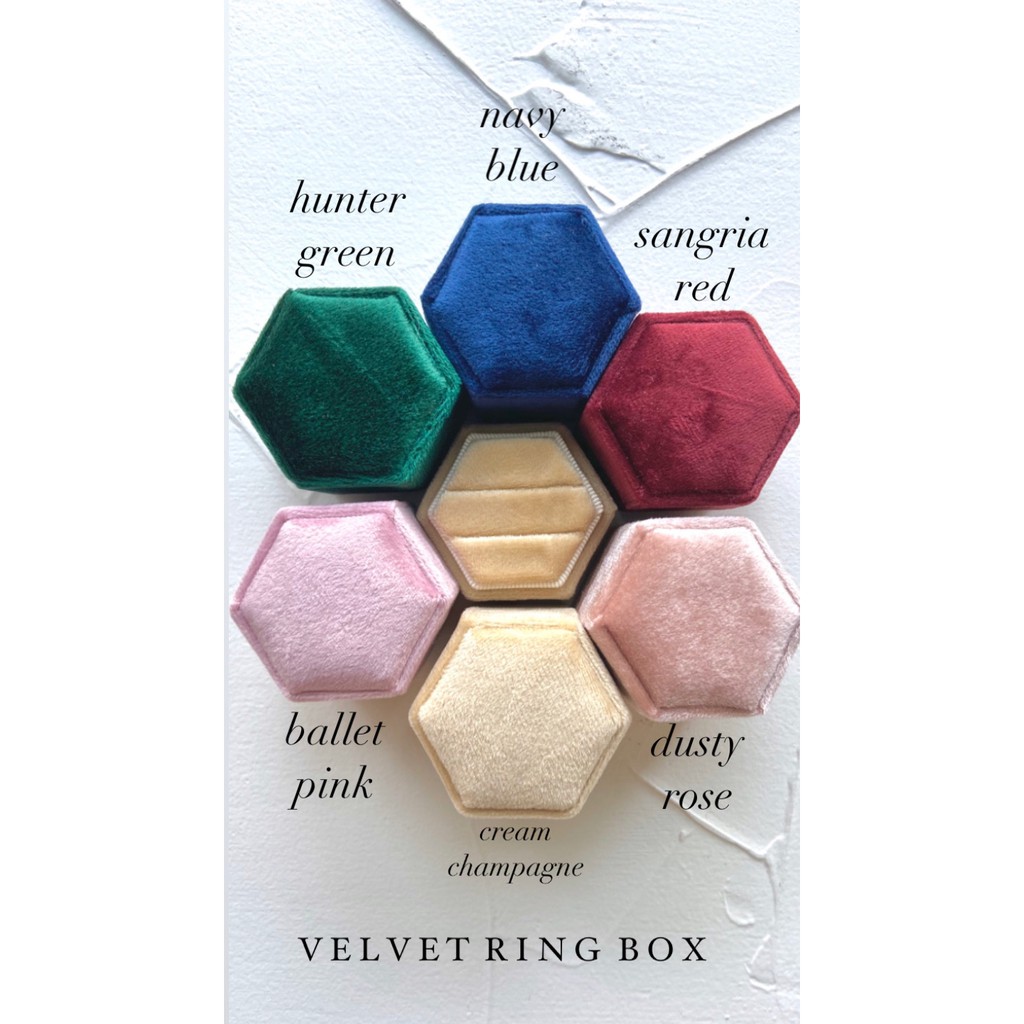 Velvet Ring Box Double Slot untuk tempat wedding rings / photography styling:Bentuk Hexagon / Segi 6 tersedia warna:hunter greennavy bluesangria redballet pinkdusty rosecream champagneBentuk Square/ Kotak tersedia warna:ballet pinkdusty rosecream champagnemohon indikasi warna dan bentuk yang diinginkan di noteuntuk tambahan monogram di listing ter