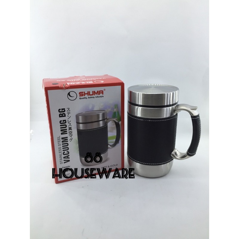 Kapasitas : 600 ml dan 450 ml* Material : Stainless steel anti karat* Lapisan : Dinding tabung ganda* Aksesoris : Gagang dan permukaan mug BG di lapisi kulit* Tambahan : Dapat menyimpan air panas dan dingin* Lain-lain : di lengkapi dengan saringan teh.Keunggulan Produk :Shuma Vacuum Mug terbuat dari stainless steel yang memungkinkan Anda menikmati minuman panas di mana saja, karena minuman Anda akan tetap panas selama 8-12 jam..Material Stainless SteelDengan bahan yang aman untuk tempat minuman/makanan yaitu Food Grade 304 18/8 Stainless Steel yang akan menjaga kualitas minuman/makanan Anda menjadi lebih baik. selain itu juga memiliki daya tahan yang sangat baik dimana dapat bertahan hingga suhu 60 derajat Celcius selama 8 jam, dan suhu 42 derajat Celcius selama 12 jam.Bebas BPABisohenol A (BPA) merupakan bahan kimia kontroversial yang dapat ditemukan pada lapisan kaleng makanan, botol air tertentu dan banyak lagi, sehingga Shuma hanya memroduksi yang bebas BPA. Beberapa peneliti telah menghubungkan sejumlah isu termasuk efek perilaku dan perkembangan pada anak-anak. Shuma merupakan produk yang aman digunakan oleh Anda dan keluar
