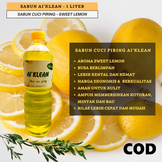 SABUN CUCI PIRING AI'KLEAN KEMASAN 1 LITERKeunggulan Sabun Ai'Klean - Sangat ampuh membersihkan kotoran, lemak ataupun minyak dan bau - Mencuci menjadi mudah dengan busa berlimpah.- Aman untuk dipakai, keset dan kinclong- Kental, jadi lebih Hemat dan Higinies- Aroma Sweet LemonPengiriman menggunakan kurir selain kurir instan (Grab/Gosend) seperti JNE, Sicepat, Anteraja, Kurir marketplace, dsb rawan kebocoran walaupun sudah ada sticket fragile, karena handling nya kurir sering kurang baik.Kebocoran saat pengiriman merupakan resiko pembeli, tidak bisa retur atau request tukar.Order berarti setuju ya.Selamat Berbe