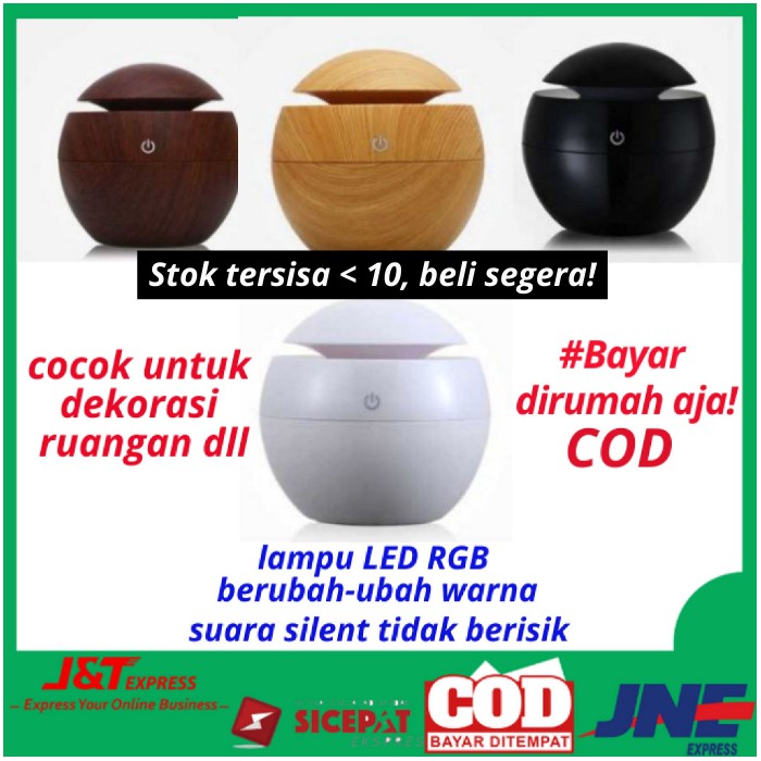 AROMATHERAPY HUMIDIFIER DIFFUSER PEWANGI RUANGAN=================================================== PASTI READY STOCK Langsung order gan♂ BAYAR DITEMPAT (COD) Via Kurir J&T✈ J&T JNE dan SICEPAT kirim hari yang sama FREE / SUBSIDI ONGKIR By Shopee :=================================--> Pembayaran dilakukan dengan Shoppe PayHumidifer ini berfungsi untuk menjaga kelembaban udara dan juga dapat digunakan sebagai aroma therapy dengan menaruh sedikit pewangi didalam airnya.Terdapat Logo Taffware pada fisik produk.Natural Moisture from The HumidifierAlat ini akan mengeluarkan mouisture air yang membuat udara tetap terjaga kelembabannya terutama diruangan ber-AC. Dapat juga menggunakan essential oil untuk menciptakan wangi ruangan yang semerbak.Wooden DesignTerbuat dari bahan bertekstur kayu yang membuat humidifier ini cocok dijadikan sebagai hiasan dekorasi ruangan.RGB LightHumidifer ini juga memiliki LED sehingga dapat menghasilkan cahaya dan berfungsi sebagai lampu tidur. LED ini juga menggunakan LED sehingga dapat berubah-ubah warna.Silent OperationHumidifer ini tidak berisik saat dRGB igunakan sehingga Anda dapat tidur dengan tenang tanpa terganggu suara berisik.1 x Aromatherapy Air Humidifier Desain Kayu1 x Kabel Power1 x Manual Untuk penggunaan langsung dibaca saja di buku manual ya kak :DKapasitas Air 130mlVoltase Voltage: DC 5VDimensi 10 x 9.5 mmHappy Shoppi