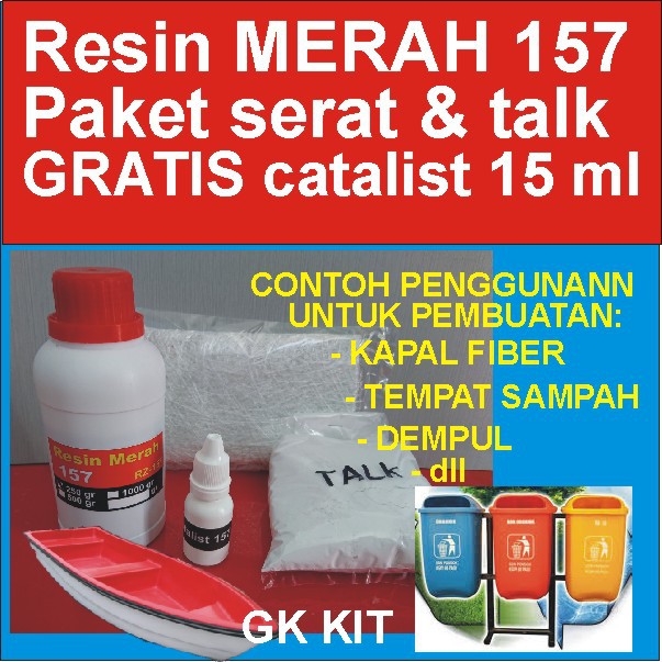 Paket belajar Resin butek / resin 157/resin merahbiasanya di pakai pada pembuatan mainan model ,body kapal fiber glass, tempat sampah, kursi taman dllreferensi penggunaan katalis 1-2 % dari berat resin, atau disesuaikan melalui coba-coba jika dirasa terlalu lama proses pengeringannya bisa ditambahkan katalisnya.yang di dapat dari pembelian paket belajar resin ini:- 250 gr resin 157- 15 ml /25 gr katalis- 300 gr talk powder (filler pada percobaaan pembuatan dempul/ boneka model)- 25 gr serat fiber ( sebagai serat penguat)Untuk pengiriman luar jawa gunakan POS ya Gan..Selamat ber