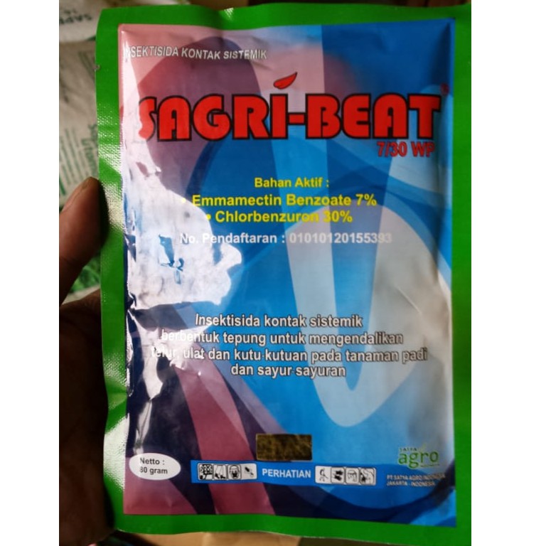 SAGRIBEAT 7/30WP 80GRINSEKTISIDABahan aktif : emmamectin benzoate 7% , chlorbenzuron 30%Insektisida kontak sistemik berbentuk tepung untuk mengendalikan telur, ulat dan kutu-kutuan pada tanaman padi dan sayur-sayuranPETUNJUK PENGGUNAANPenyemprotan dapat dilakukan saat serangan hama mulai nampak dan diulang dengan interval 3 - 5 hari*Bawang merahPenyakit : ulat grayak, telor ulat, aphids, thrips, liriomyza, mitesKonsentrasi : 0,25 - 0,5 gr/ltr airInterval penggunaan : 3 - 5 hariNetto